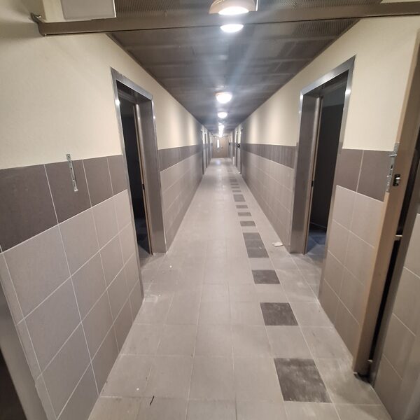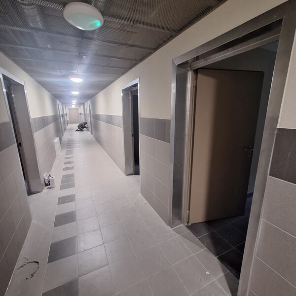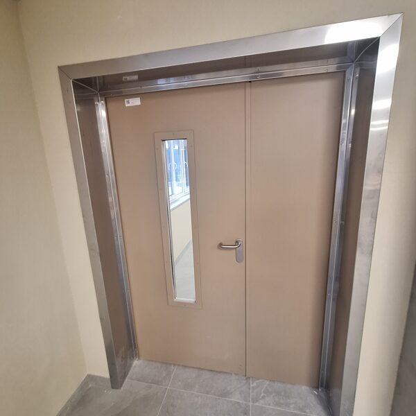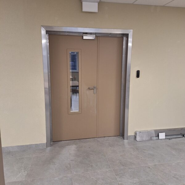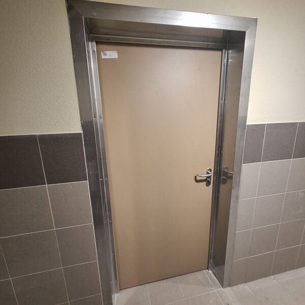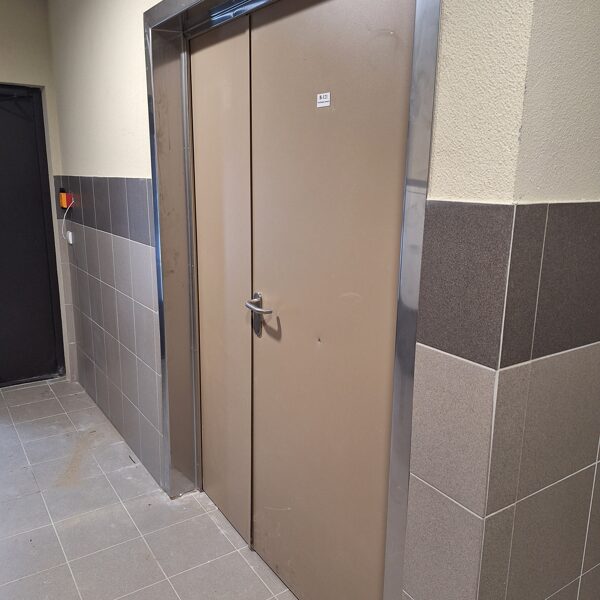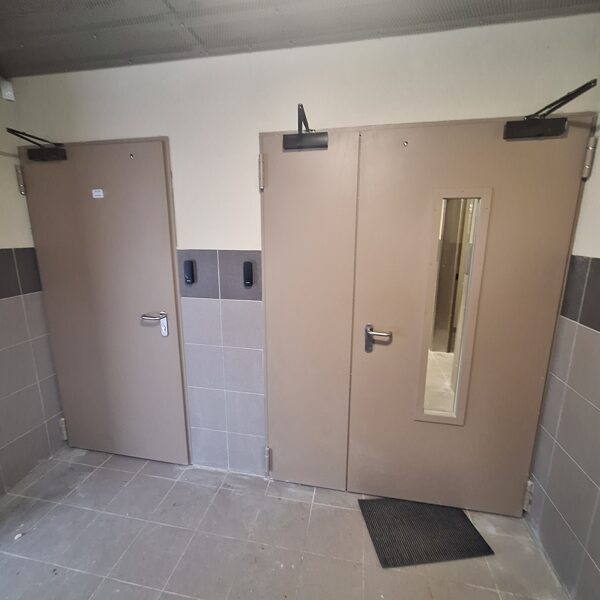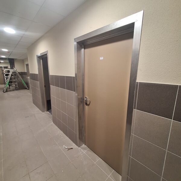 Visos vidaus durys šiame objekte buvo apskardintos nerūdijančio plieno apdaila, kas ne tik suteikia modernų ir elegantišką įvaizdį, bet ir garantuoja ilgaamžiškumą bei atsparumą nepalankioms sąlygoms, pabrėžiant pabradės administracinių pastatų saugumą ir patvarumą.
